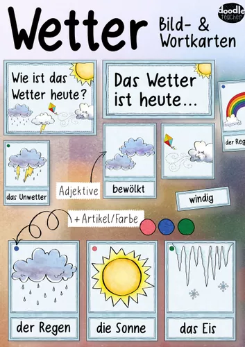 - Actividad de inicio: escucha y practica las canciones de saludo en alemán. Luego, entona la canción de la semana: "Das ist gerade". Después, repasa el vocabulario del clima mediante flashcards: Es ist sonnig, regnerisch, schneit, windig, stürmisch, frostig.